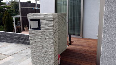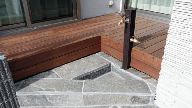 素材はメンテナンスのかからないアルミやタイルですが、見た目は天然木(木目アルミ細格子)や天然石(細割ボーダー)