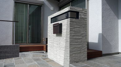 門柱はリビングの目隠しを兼用し、L型にすることにより立体化を出しています。