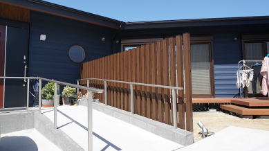 親世帯はリビング前に木目調の目隠しを設置し、