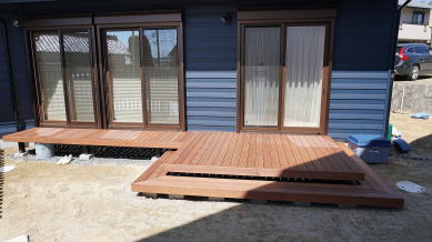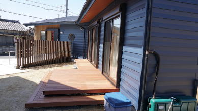 親世帯は自然木(アマゾンジャラ製)の広いウッドデッキを設置し、