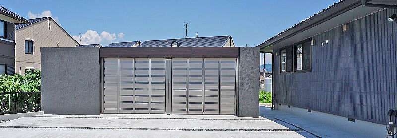 基本 オープン外構ですが,敷地の奥には台形のガレージが鎮座しています。