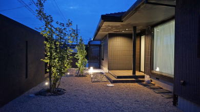 木目フレームの梁(タカショー・エバーアートフレーム)がスケール感のある和モダン外構です。