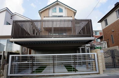 敷地の高低差を利用し、1階のリビングとガレージ上のスペースをフラットな形でつなげました。