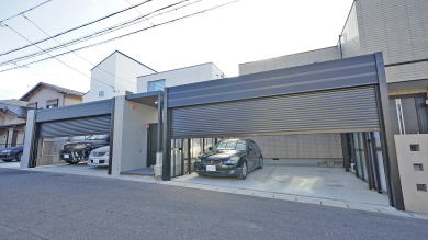 4台用電動シャッター付外構 水平ラインと垂直ラインで奏でる”グラン・エクステリア”です。