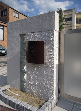 北側玄関の外構のため、明るい白に。ポストの茶色がアクセントになっています。