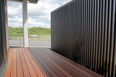南側道路で入り口がリビングの前という事もあり、ウッドデッキ前に目隠し格子を設置しました。